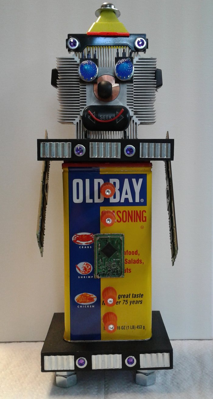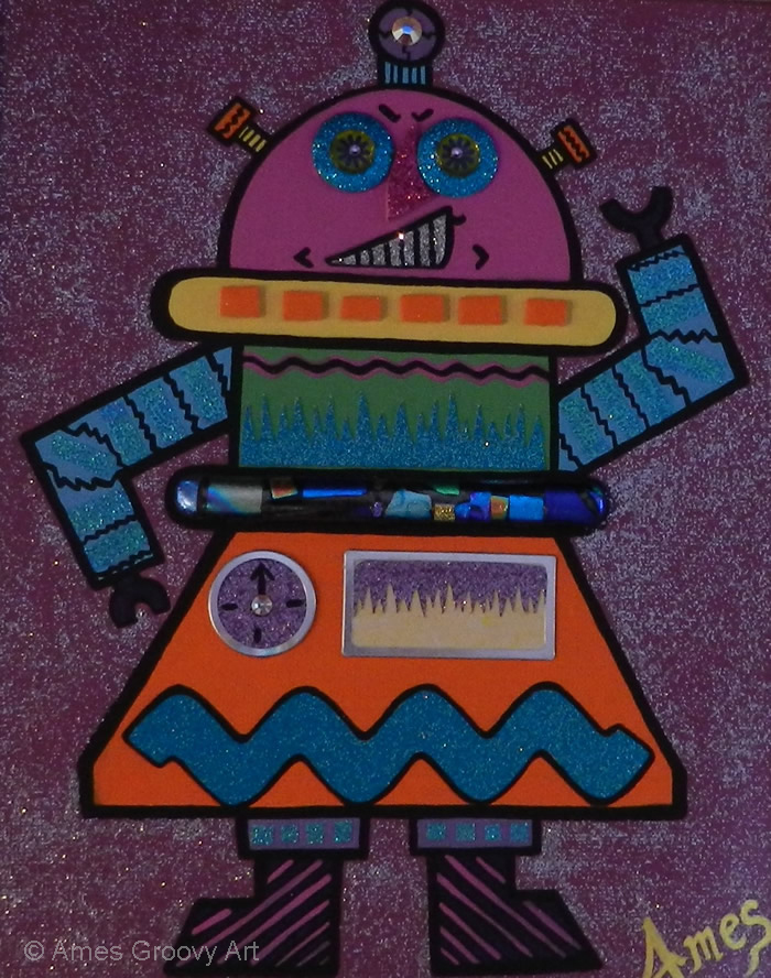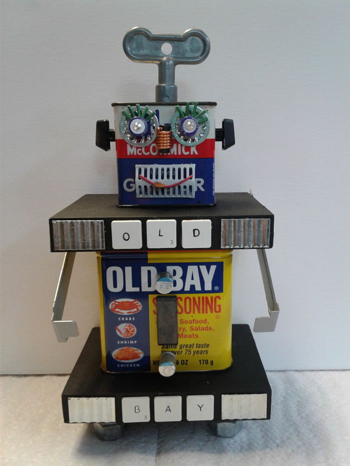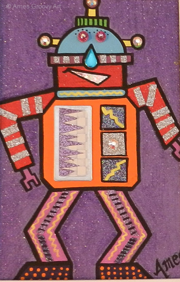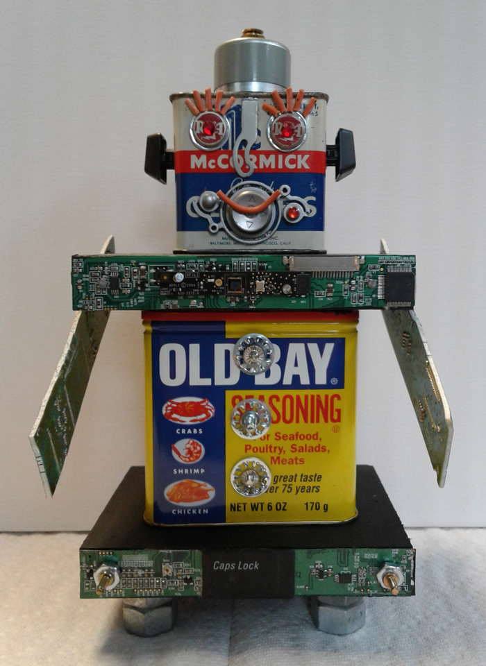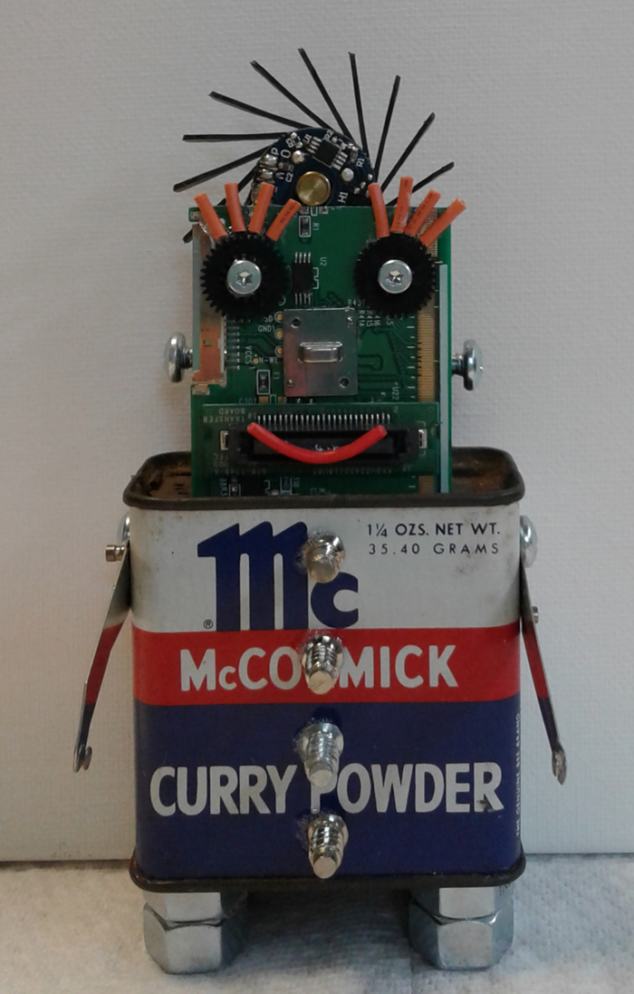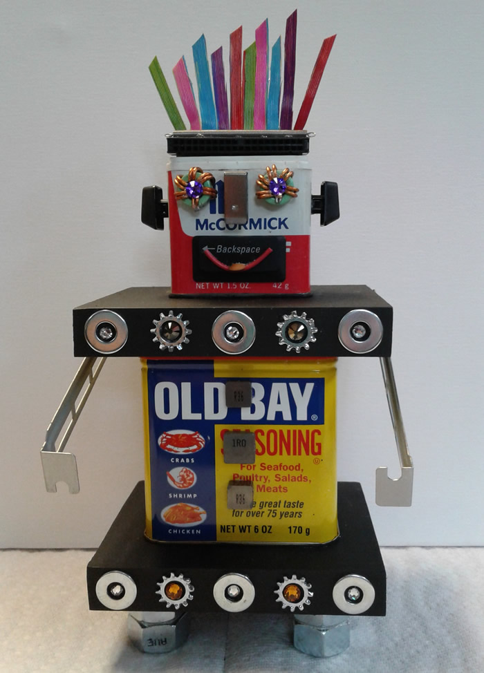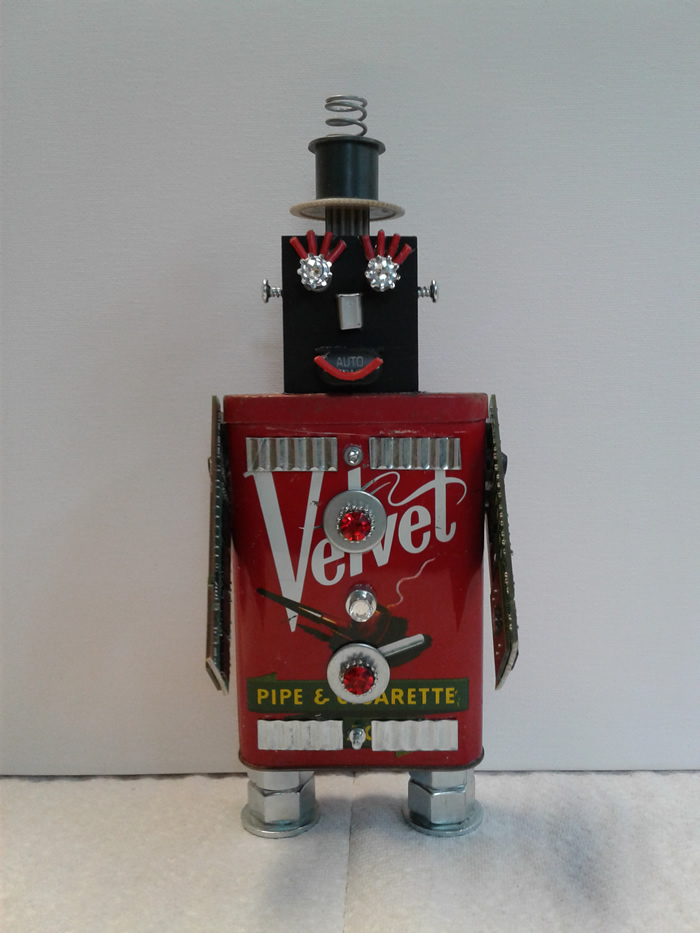 I love making Robots because they become themselves in the creative process. I embellish them with computer parts ripped from discarded PC’s or old jewelry or found objects. Each one gets a name and a kiss when they are finished and ready to be sent out into the world.