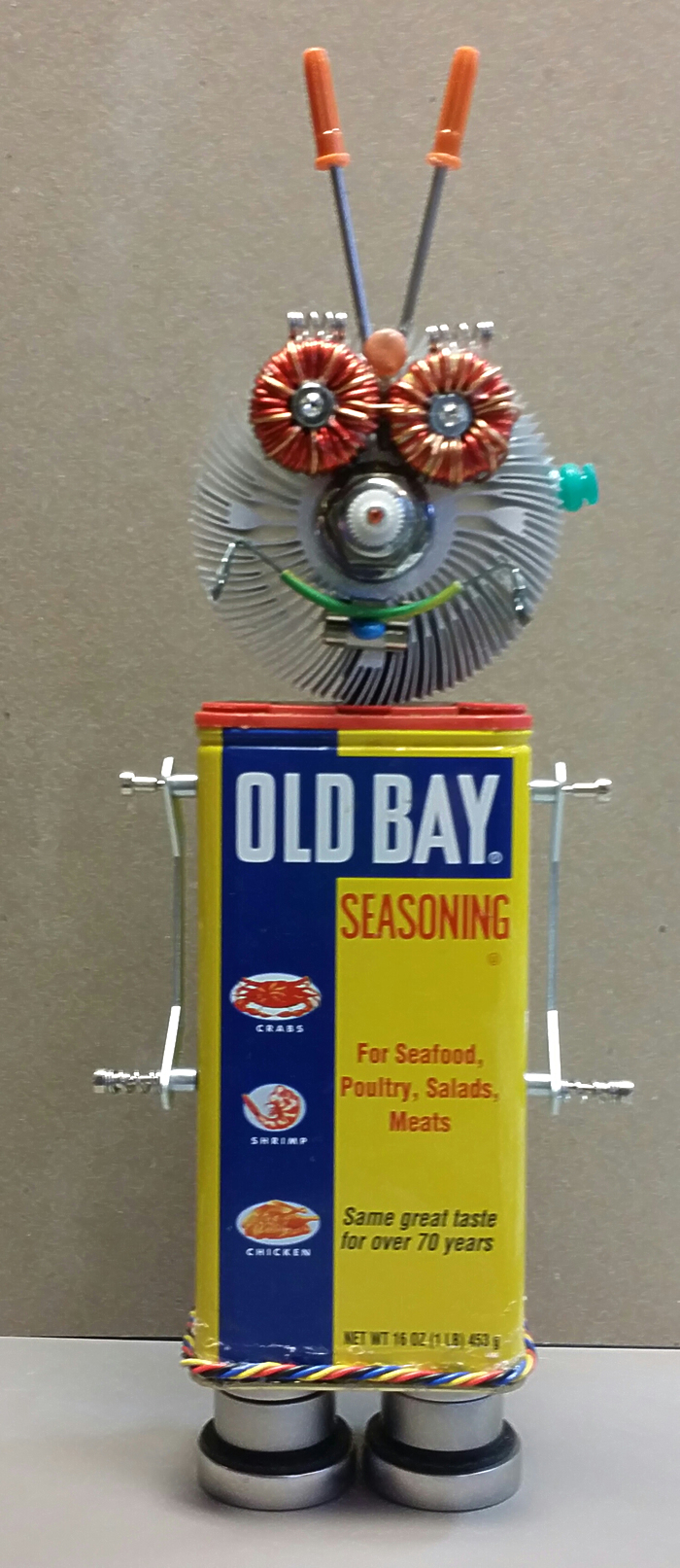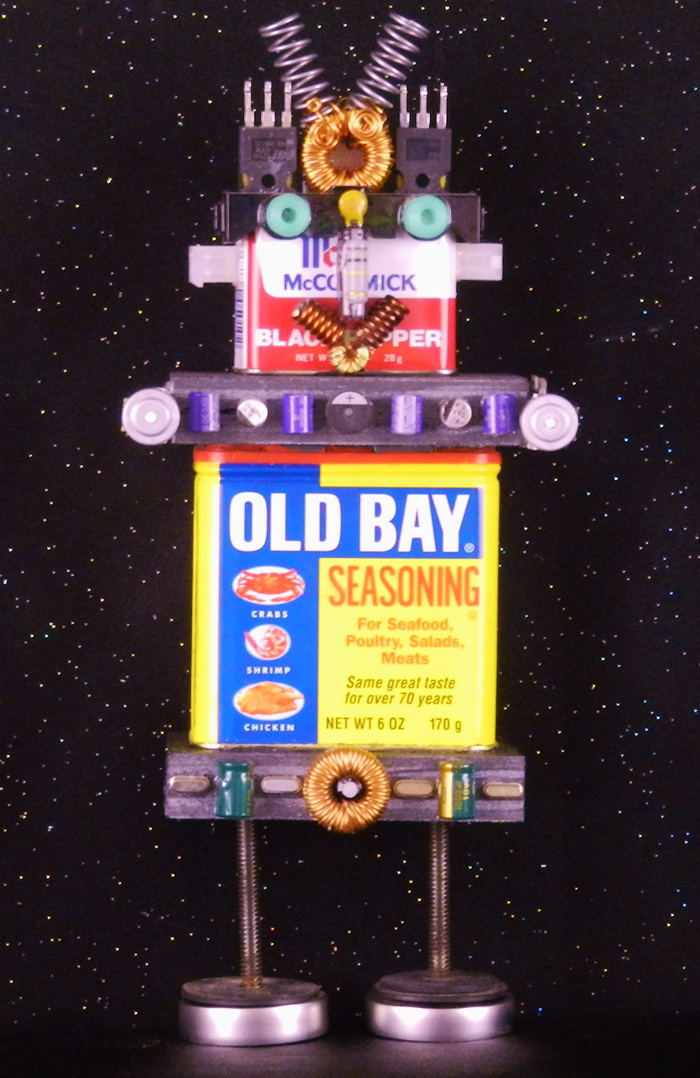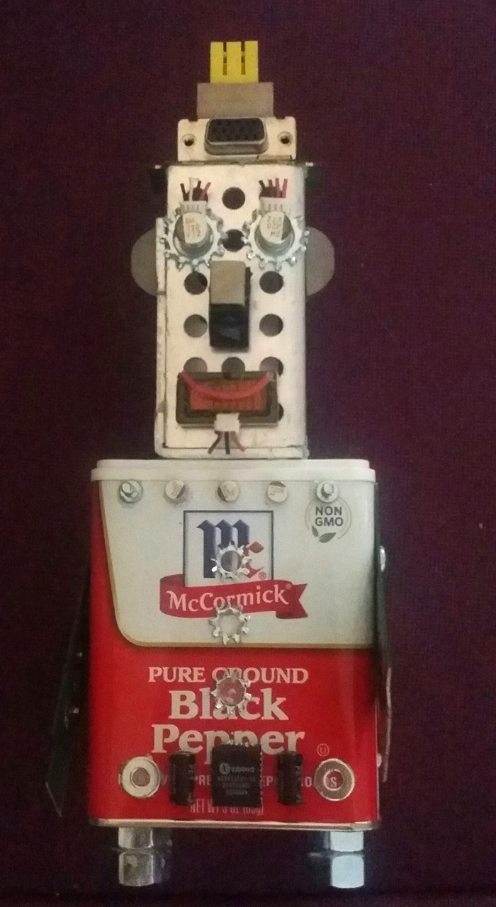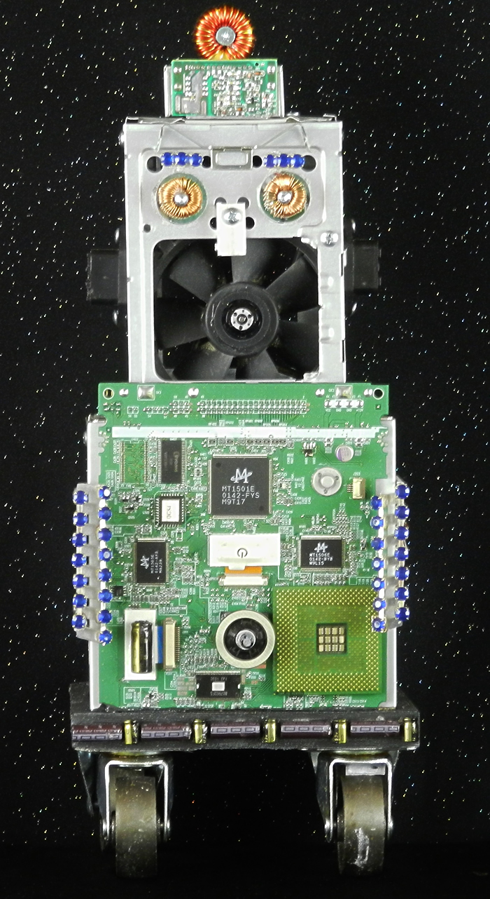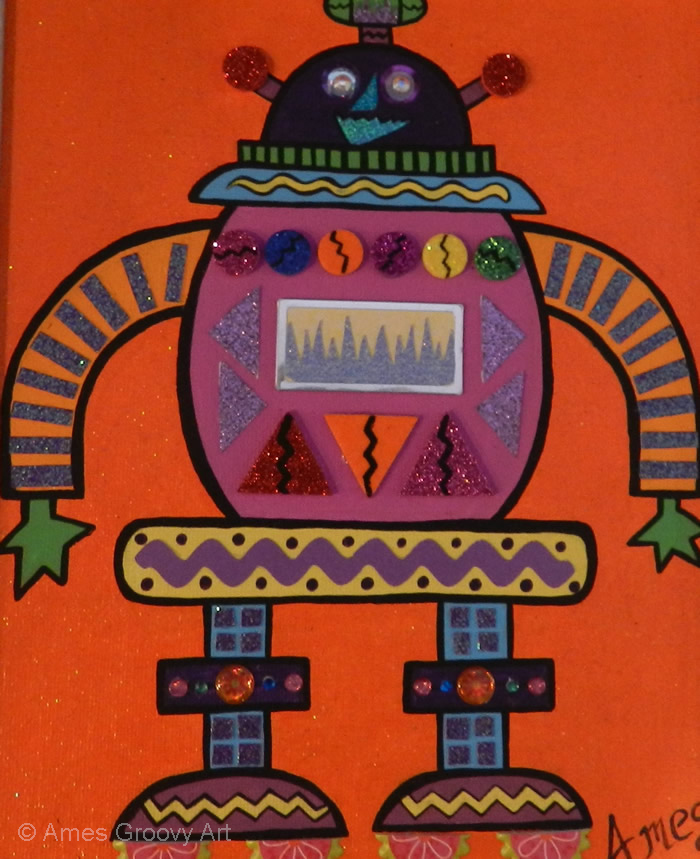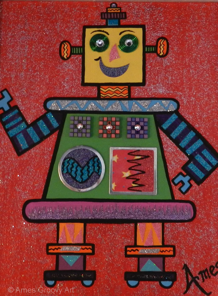 I love making Robots because they become themselves in the creative process. I embellish them with computer parts ripped from discarded PC’s or old jewelry or found objects. Each one gets a name and a kiss when they are finished and ready to be sent out into the world.